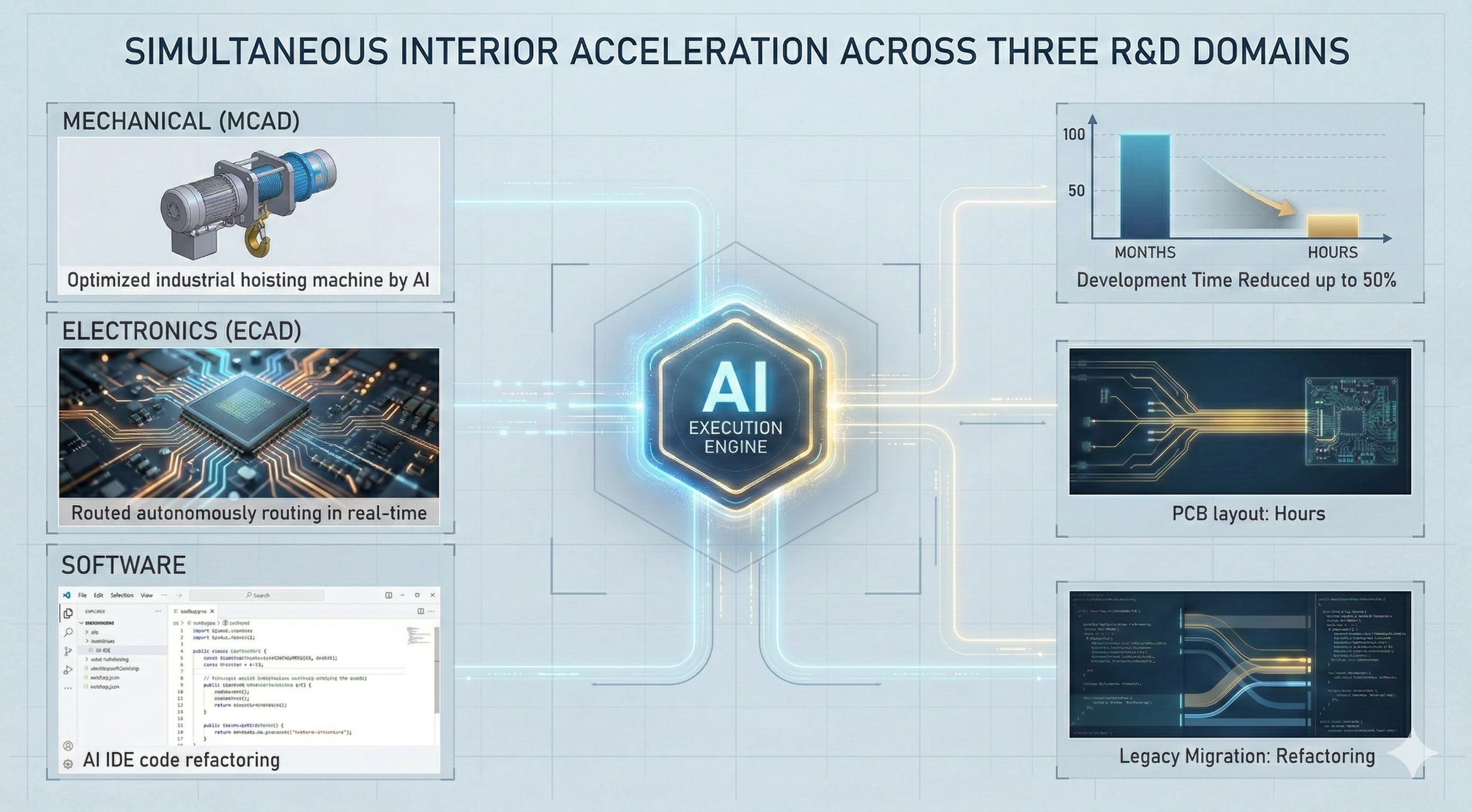 Electronics (ECAD): We can leverage “physics-first” AI like Quilter for autonomous PCB layout. It doesn’t just copy human patterns; it solves for signal integrity and thermodynamics. A potential risk to manage here is ensuring that AI-generated layouts remain serviceable by human technicians in the field.