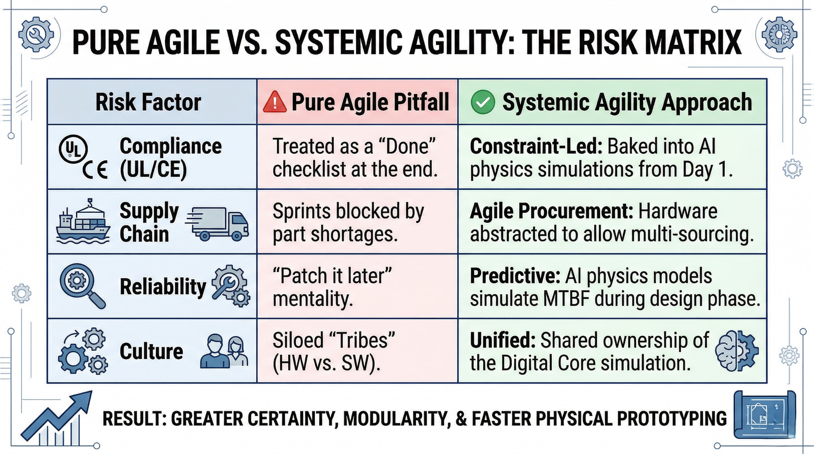 Agile Procurement: You cannot have a 2-week sprint if your components have a 26-week lead time. We integrate Procurement as a core R&D stakeholder, using “Design-for-Availability” to ensure our supply chain is as modular as our code.